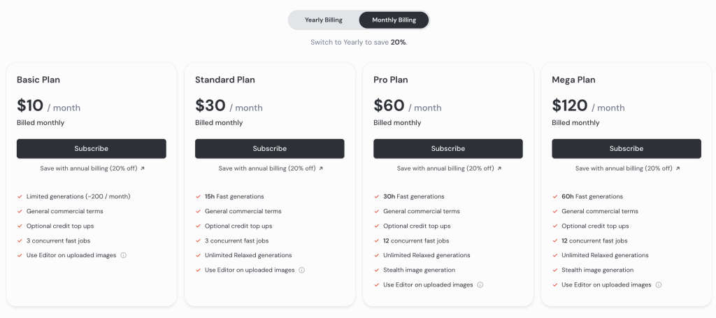 Hiện tại (tháng 5/2025) Midjourney có tất cả 4 gói, từ $10, khoảng 250k tới $120, khoảng 3 triệu.