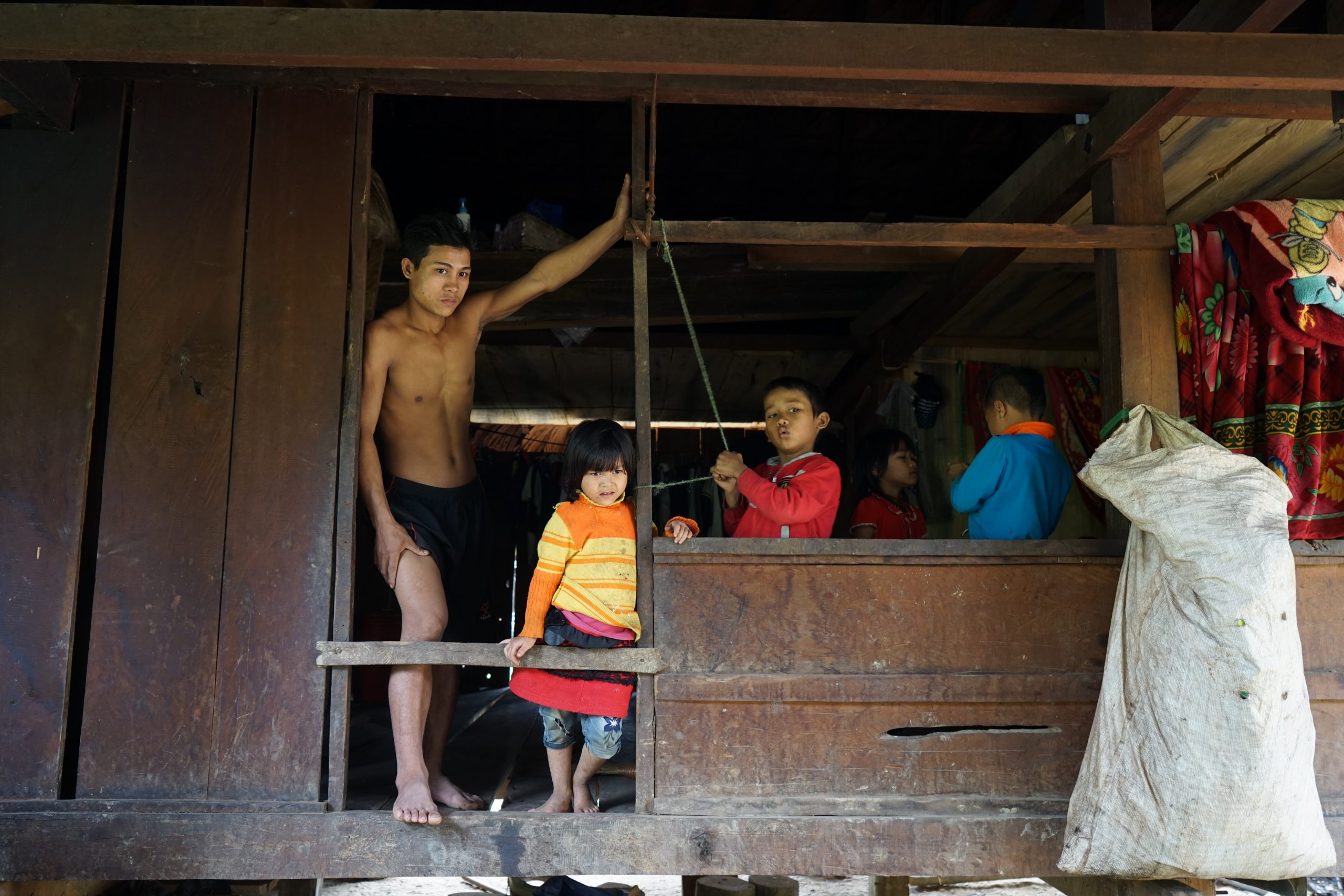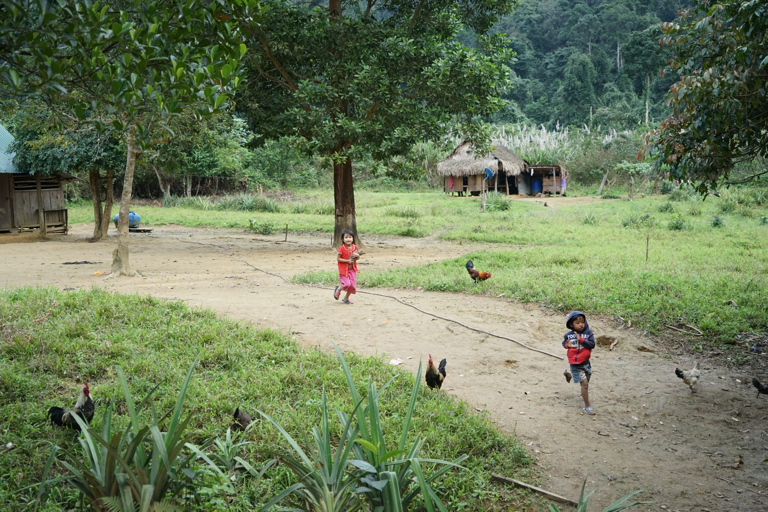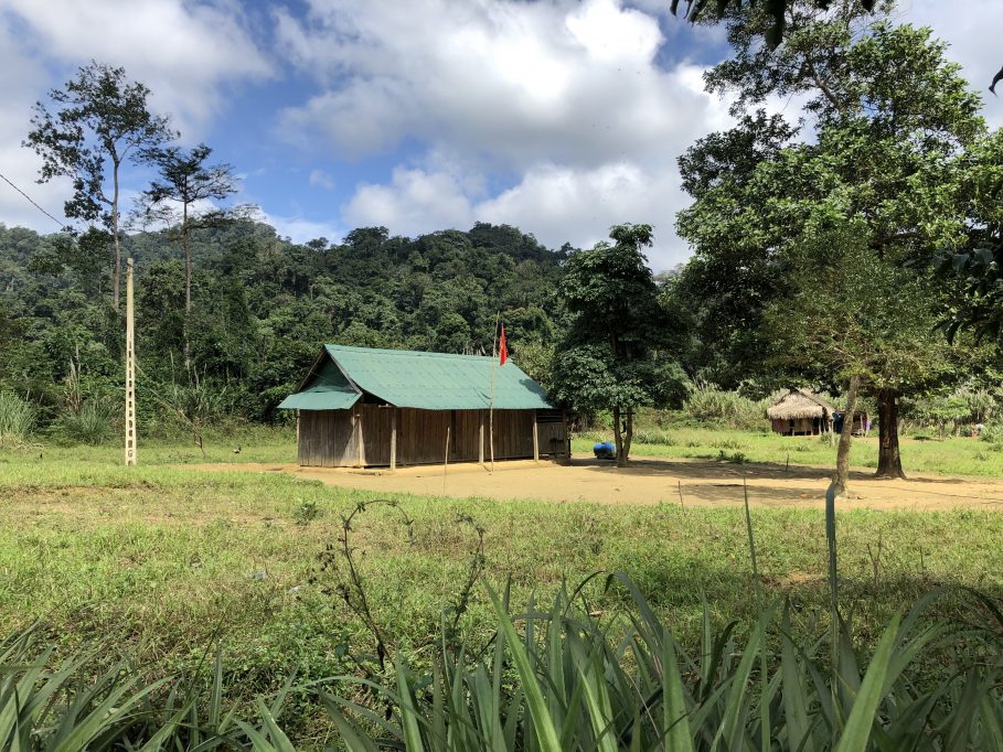 Chúng tôi đi bộ băng qua khá nhiều con suối nhỏ và dừng chân tại Bản Đoòng, người Vân Kiều. Gọi là Bản nhưng ở đây rất vắng người, chỉ lác đác vài tòa nhà xung quanh.