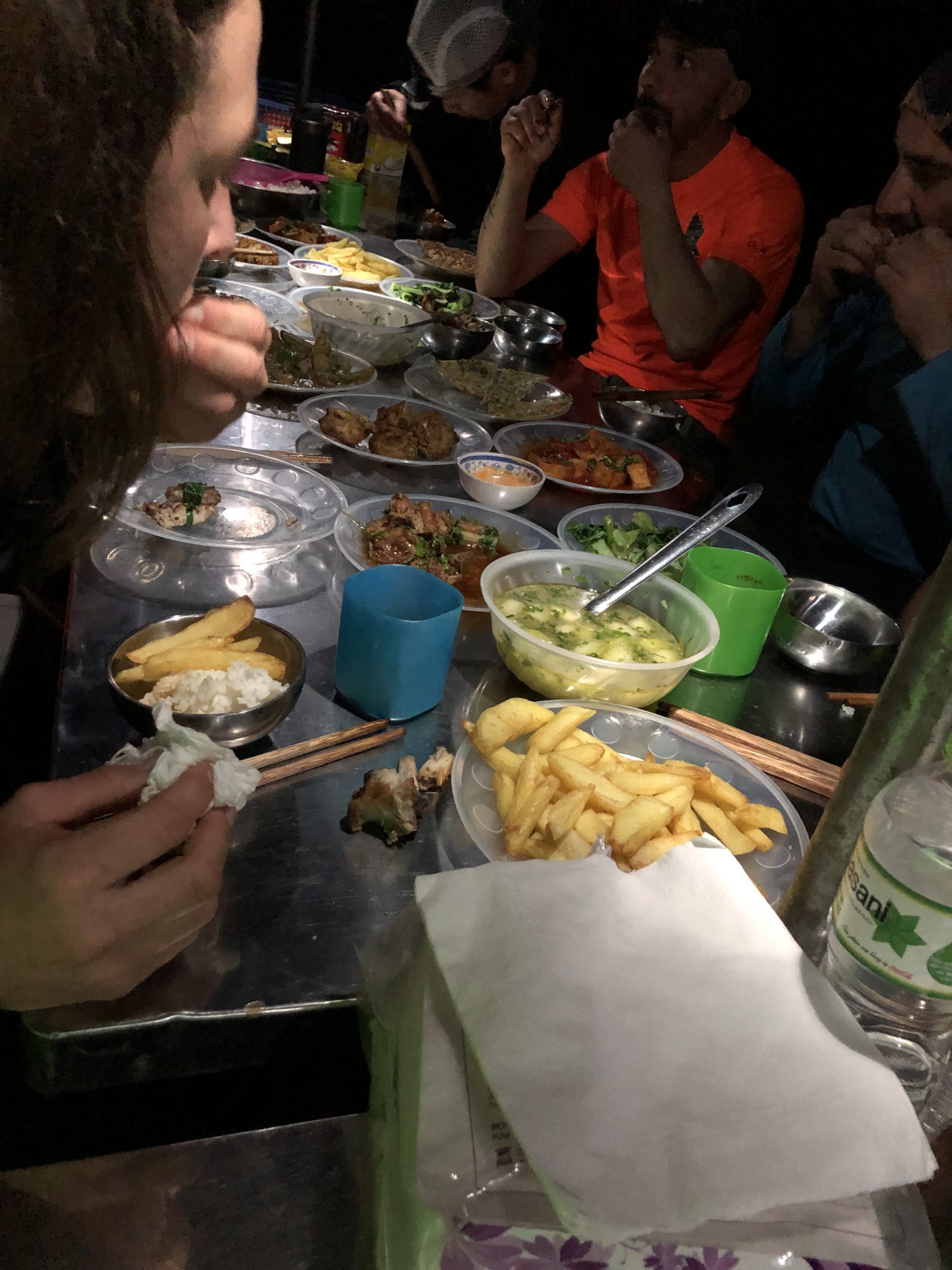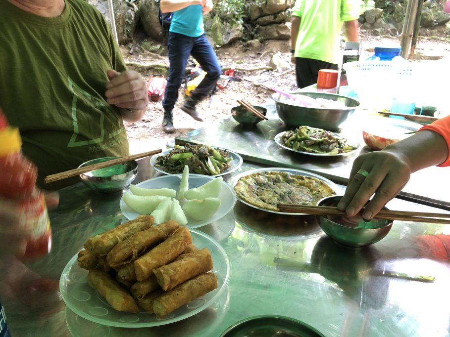 Chúng tôi dùng bữa tối rất sớm, vì ánh sáng trong hang nhanh tối hơn bên ngoài rất nhiều. Trong hơn 10 người trợ lý, poster theo đoàn, có cả đầu bếp. Chính vì thế bữa ăn toàn bộ hành trình ngon vô cùng, đặc biệt sau cả ngày hoạt động mệt mỏi.