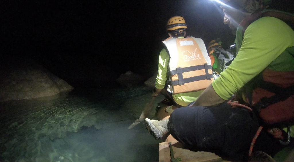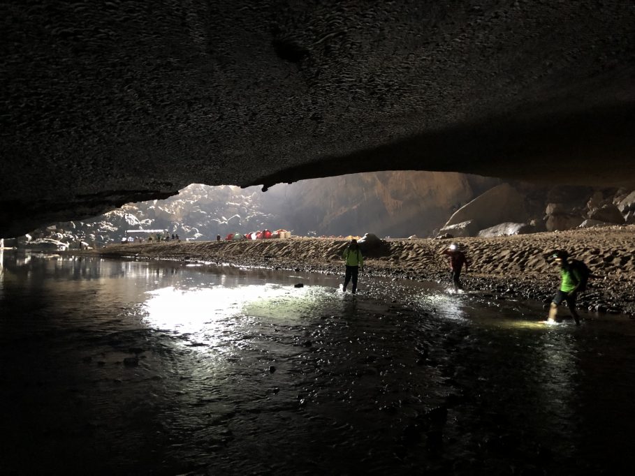 Đây là ngày cuối cùng cuối cuộc hành trình khám phá hang Sơn Đoòng, chúng tôi rời bãi trại số 2 để tiến đến cửa hang. Để đến với cửa hang, chúng tôi phải băng qua 1 con suối khá dài bằng thuyền.