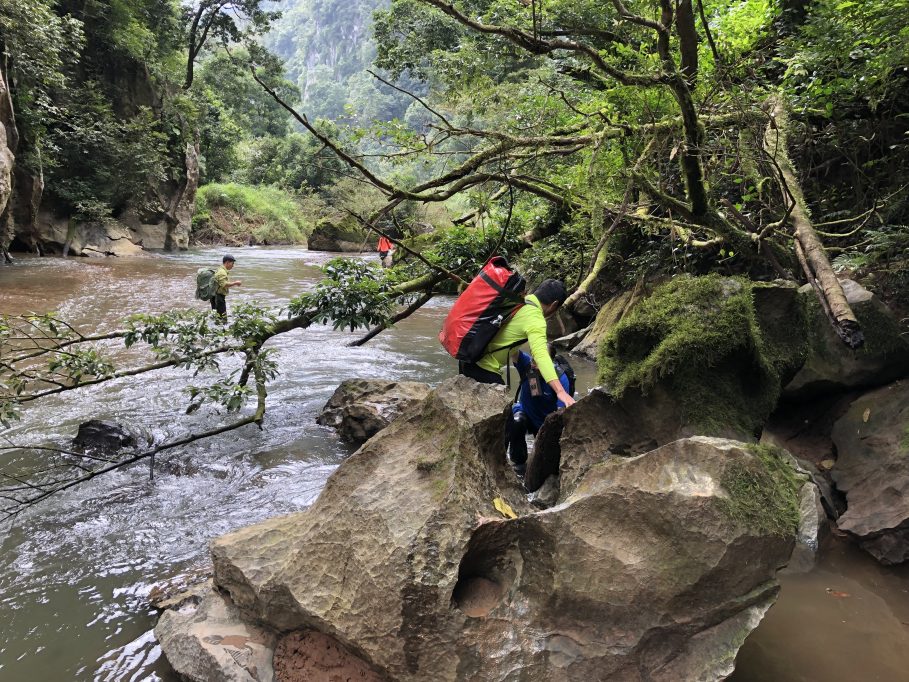 Bước sang ngày thứ 2, chúng tôi tạm biệt hang Én và đi tiếp. Lội qua những con suối, vách đá nhỏ, tối hoàn toàn và cần đến đèn pin.